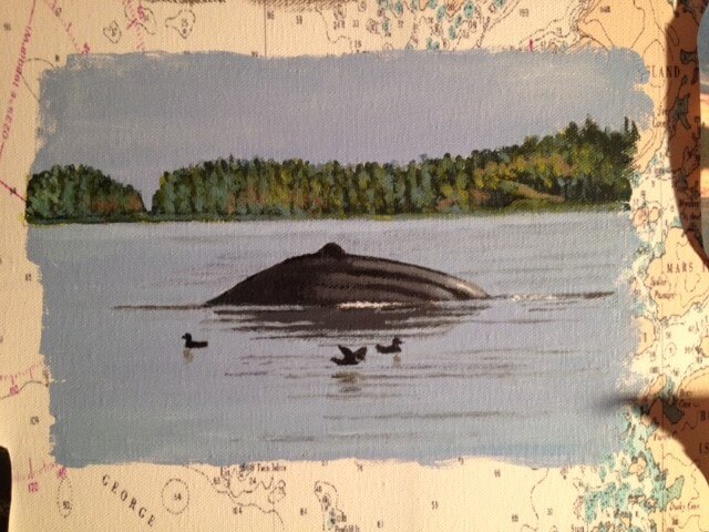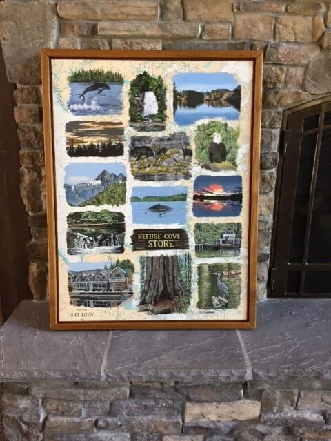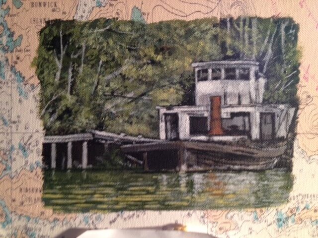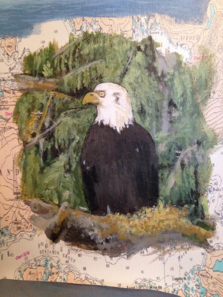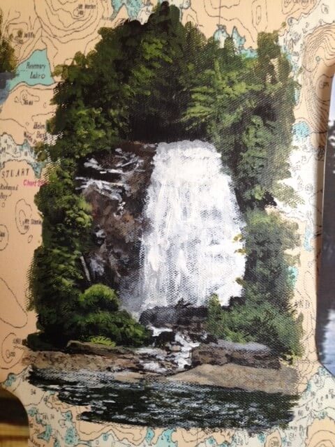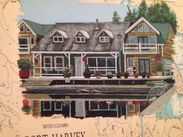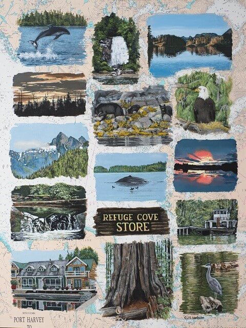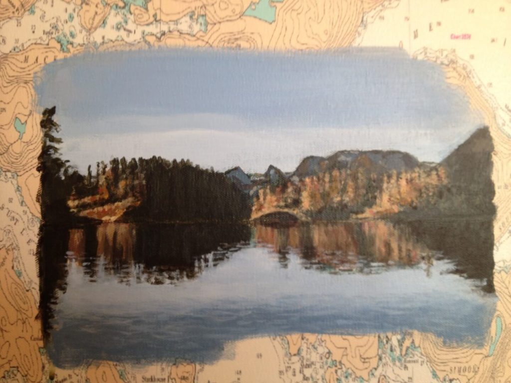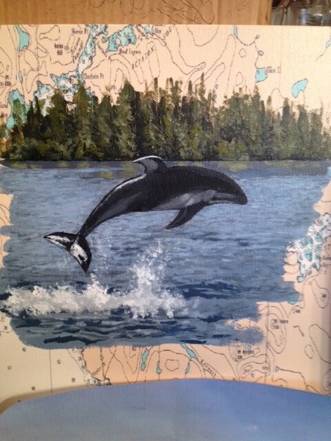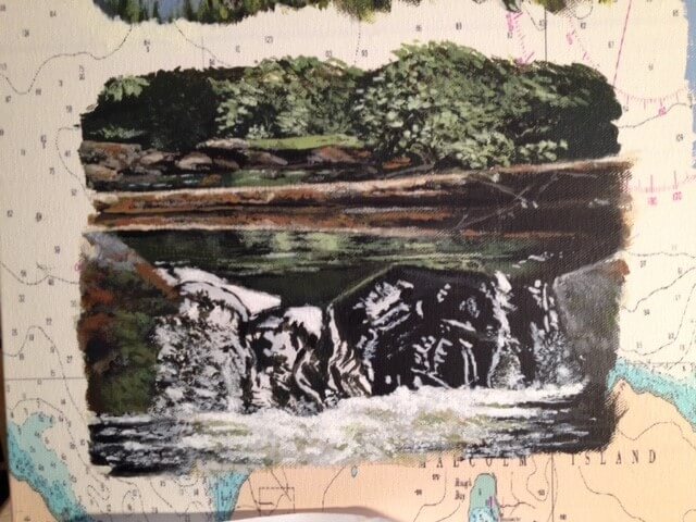 I was asked to create a collage painting for a customer’s yacht. The customer provided me with many photographs they had taken throughout the years from their annual cruises along the coast of Canada. Together we selected some of their favorites, and I painted them onto a 30” x 40” canvas which had been imprinted with a map of Northern Vancouver Island. The customer made the frame himself using teak wood, a frame that beautifully enhanced and completed my work.
