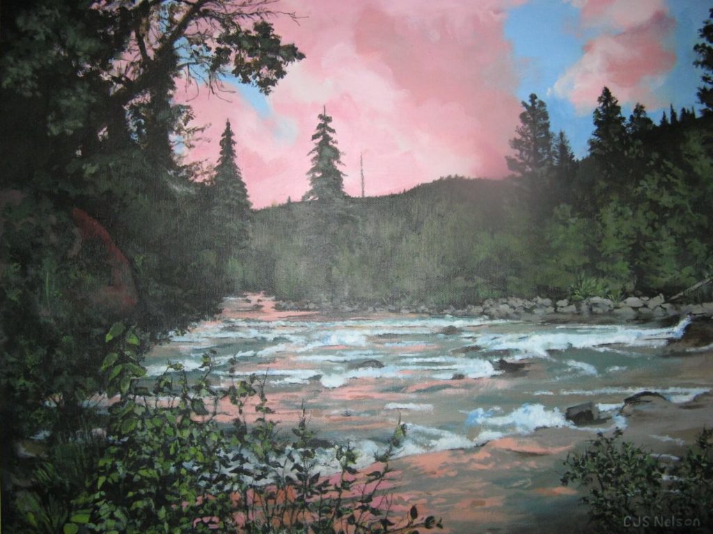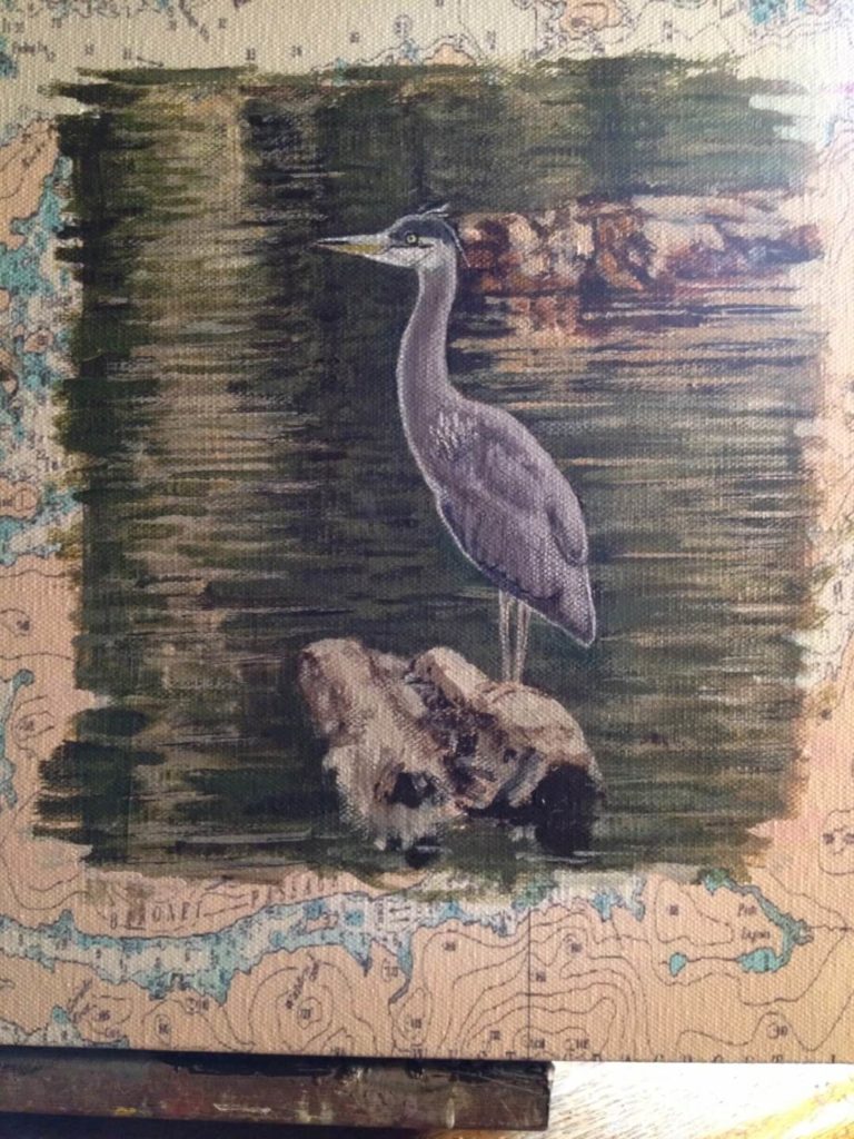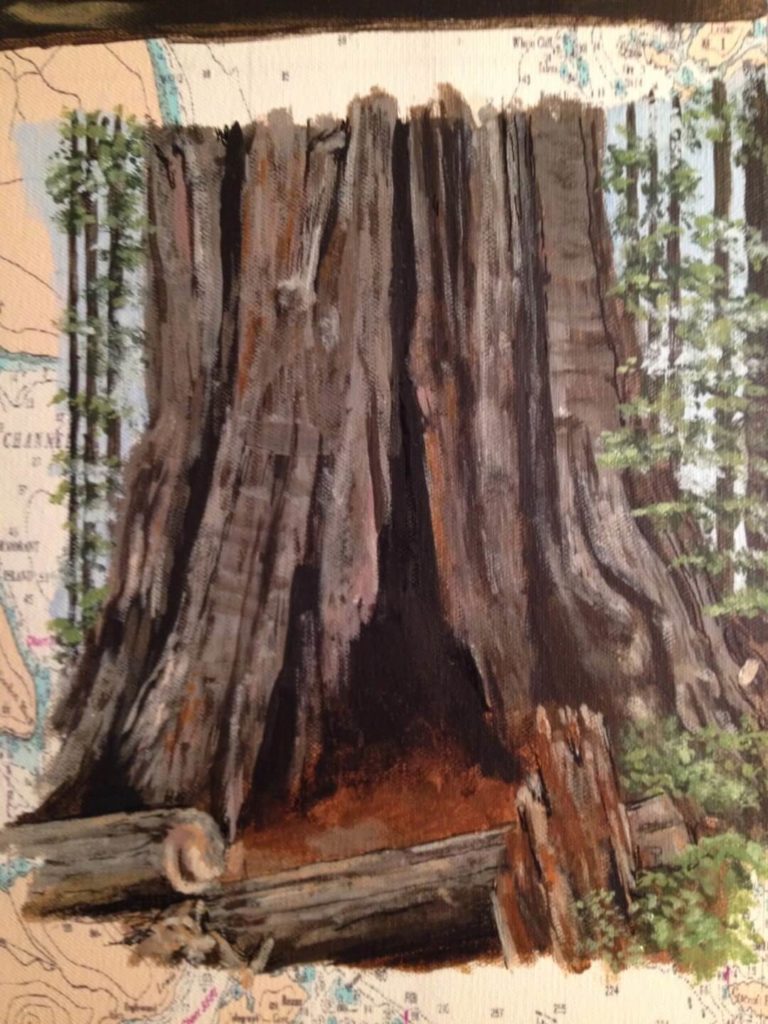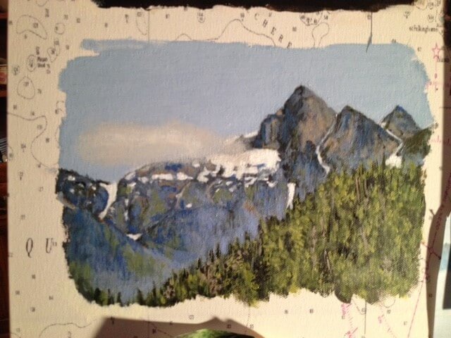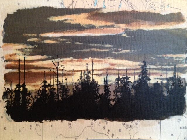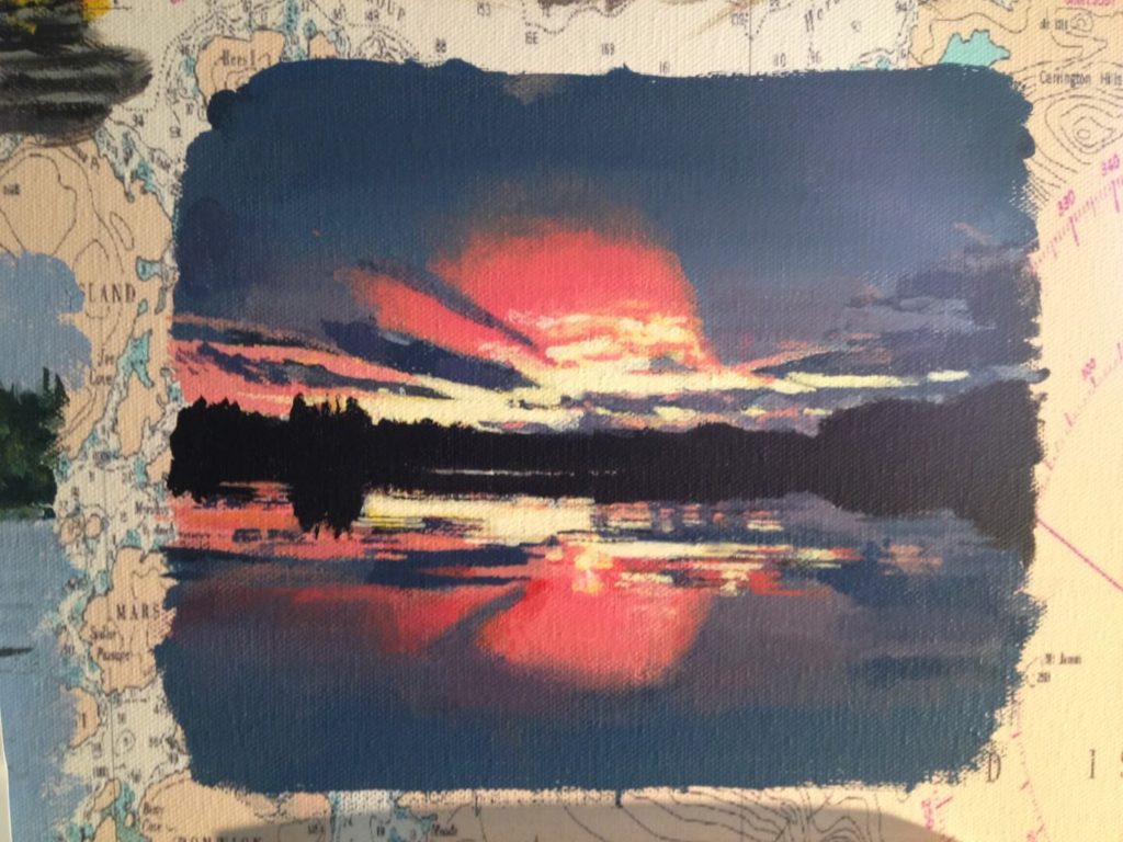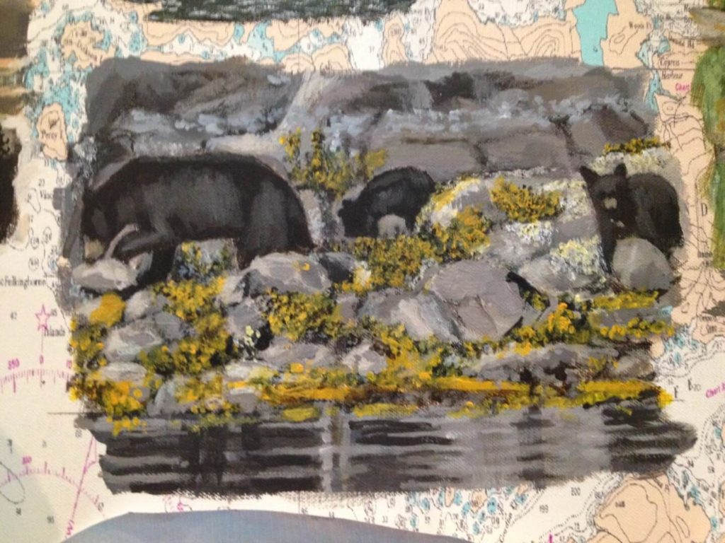 I was asked to create a collage painting for a customer’s yacht. The customer provided me with many photographs they had taken throughout the years from their annual cruises along the coast of Canada. Together we selected some of their favorites, and I painted them onto a 30” x 40” canvas which had been imprinted with a map of Northern Vancouver Island. The customer made the frame himself using teak wood, a frame that beautifully enhanced and completed my work.